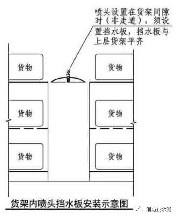 1 設置貨架內置灑水噴頭的倉庫,當貨架內置灑水噴頭上方有孔洞、縫隙時,可在灑水噴頭的上方設置擋水板;