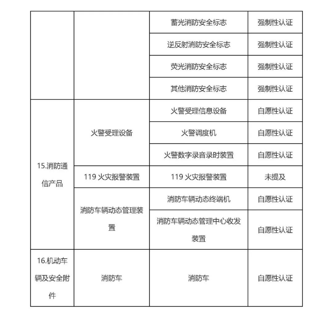 二、公共場所、住宅使用的火災報警產品、滅火器、避難逃生產品繼續實施 強制性產品認證。上述事項,自本公告發布之日起實施。