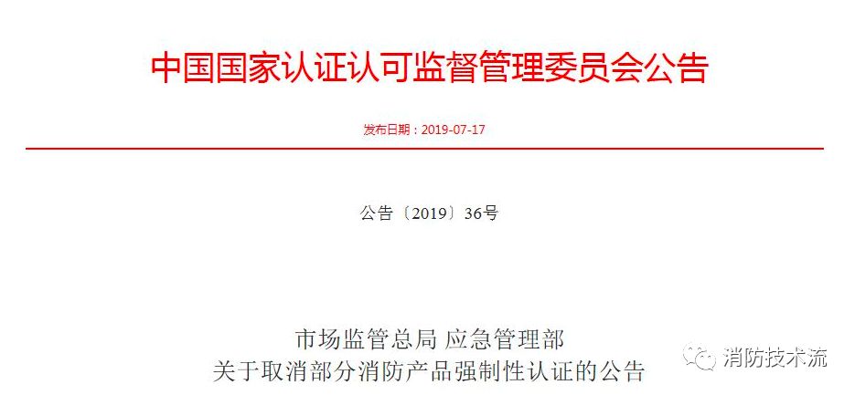 一、對部分消防產品取消強制性產品認證,市場監管總局注銷相關認證機構和實驗室涉及的強制性產品認證指定業務范圍,相關指定認證機構應 當按規定注銷已出具的強制性產品認證證書。