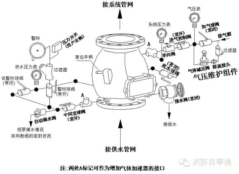 3、方便維修調試,應在干式閥前后安裝閥前供水控制閥和閥后控制閥。
