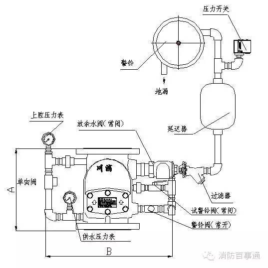 濕式報警閥與延遲器、壓力開關、水力警鈴、灑水噴頭、消防供水系統等連接組成自動噴淋滅火系統。是自動噴淋滅火系統中重要的報警控制閥門。